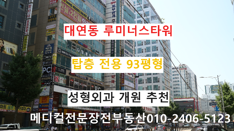 반갑습니다 장전부동산입니다 오늘은 부산 남구 대연동 소재 루미너스타워 메디컬 임대 안내를 하도록 하겠습니다 해당 매물은 현재 유일한 공실로 탑층에 위치하고 있습니다 경성대부경대역 도보 1분 거리 및 부산건강복지센터 / 부산복십자의원이 동 건물에서 영업 중입니다 치과, 내과, 피부과가 진료 중이며 동종 진료 업종 제외 임대 계약이 가능한데 탑층 매물이라 성형외과를 가장 추천드리고자 합니다 부산 지역 성형외과 개원을 계획 중이신 원장님께서는 해당 매물 검토해 보시길 바랍니다